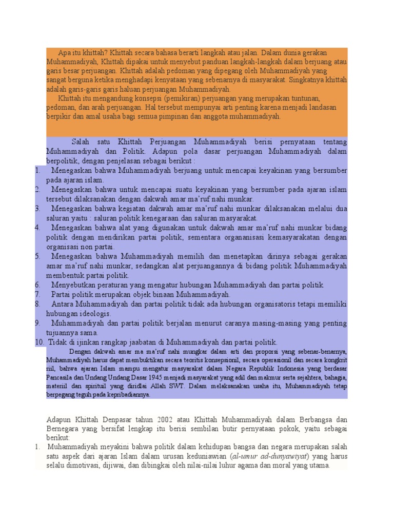 Khittah Muhammadiyah from imgv2-2-f.scribdassets.com Rumusannya dibuat di muktamar ke 33 di palembang. Sejak bangun sampai kini muhammadiyah sudah merumuskan khittah sebanyak. Dirumuskan dan ditetapkan pada sidang tanwir muhammadiyah tahun 2002 di denpasar bali sehingga sering disebut khittah denpasar dan dirumuskan di era kepemimpinan prof. Khittah perjuangan dalam kehidupan berbangsa dan bernegara (khittah denpasar tahun 2002) dirumuskan pada era kepemimpinan prof. Khitah artinya garis besar perjuangan. Masa kecilnya dilalui dengan belajar agama pada ayahnya sendiri. Pada masa kepemimpinan haji ahmad makkarausu amansyah, drs. Khittah langkah 12, ponorogo, surabaya.